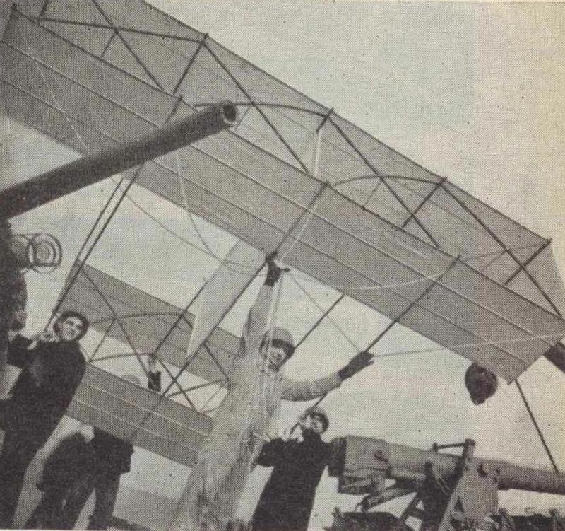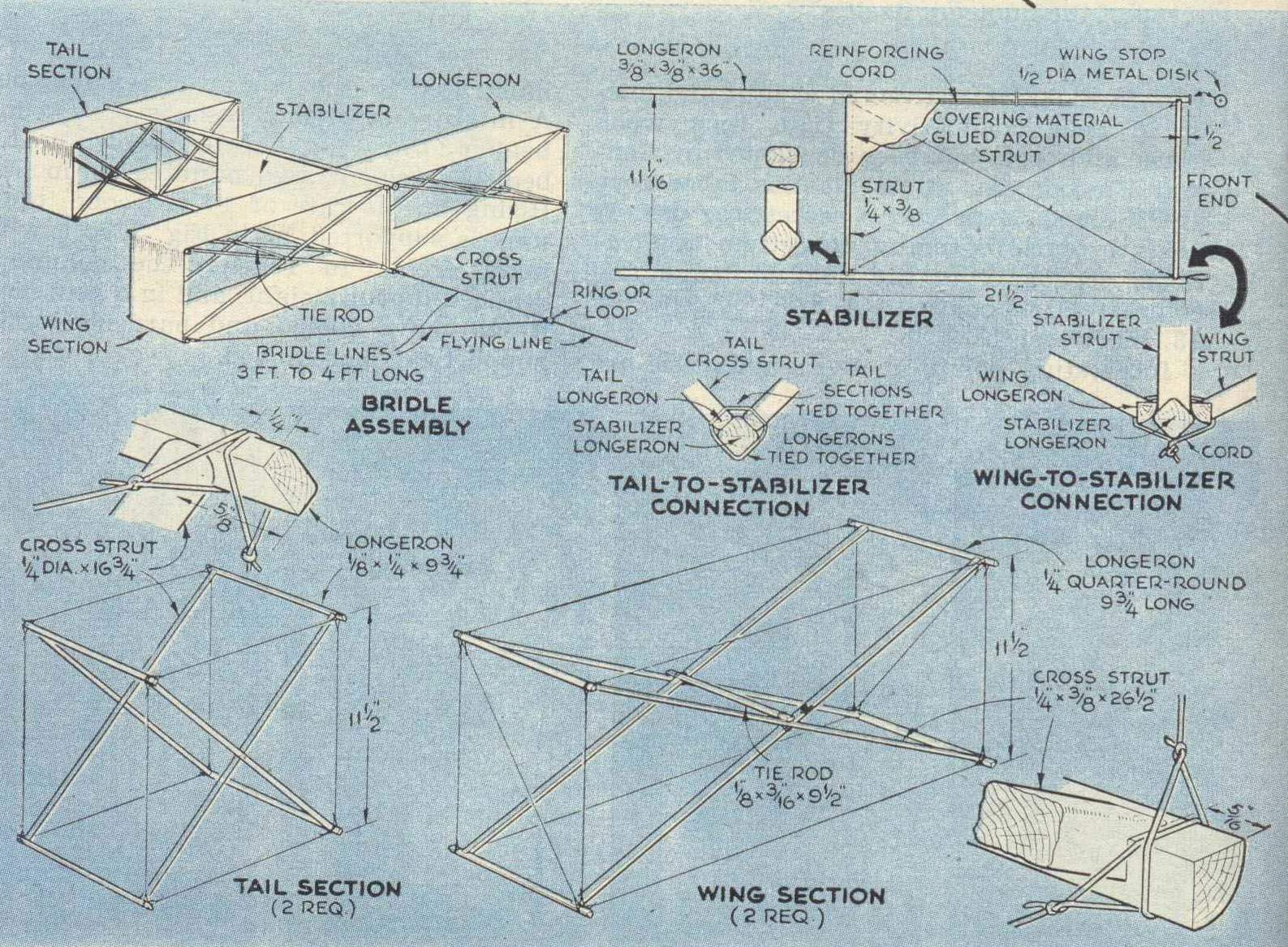 SHIPS traveling in areas that are subject to enemy air attack often use barrage kites to carry steel cables into the sky. The cables entangle any dive bomber that ventures too close. (See P.S.M., Aug. '44, p. 125.) A full-size kite would be too much for the amateur to build and handle; but here is a model with a four-foot wing spread that has enough lift to provide thrills aplenty.