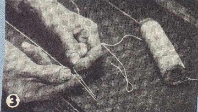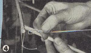 Next make the looped-end cords that hold the struts rigidly in position. Each wing section requires four horizontal, four vertical, and two diagonal lines. Use a light, strong cord. Brown waxed store string is too weak. Lightweight chalk line is acceptable, but 12 to 16-lb. fishing line is ideal. To make all the vertical lines uniform in length, use a jig consisting of two finishing nails and a board. Drive the two nails into the board so they are 11½" apart. Tie a bowline in one end of a piece of cord, leaving a loop about 1" long. Slip this loop over one nail. Pull the cord taut and double it back around the other nail, as in Fig. 3. Holding the doubled portion firmly, slip the cord off the nail and tie a bowline to form a loop like the first one. By varying the distance between the nails, you can similarly form the horizontal and diagonal ties.
