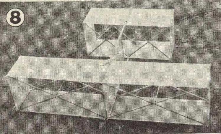 Punch small holes in the covers 1½" from the ends of the wing and tail longerons that butt against the stabilizer and reinforce them with glue or lacquer. Through these holes go 12 cords to bind the kite together. Four are used to fasten the tail sections to each other; four more pass through the same holes and tie the tails to the sta bilizer; and the remaining four are used to hold the wings to the stabilizer. The assembled kite will look like Fig. 8. It may be disassembled for storage or transportation by cutting away the 12 cords just mentioned.