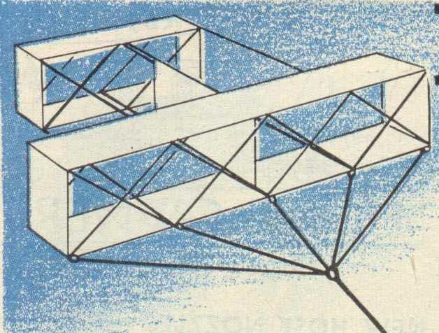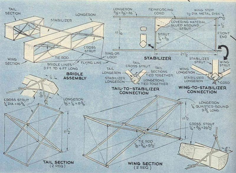 To tie the wings and the tails together, make a stabilizer section. It consists of two longerons and two vertical struts. Crossed diagonal cords stiffen the frame. Nail a small metal disk to the front end of the upper longeron to keep the wings from moving too far forward and possibly slipping off.