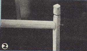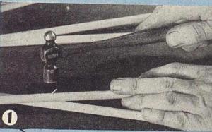 Each wing section consists of four cross struts, four longerons, and one tie rod. Mark the mid-points of these struts and fasten them together in pairs, using small nails and bending the ends over as shown in Fig. 1. Spread these pairs slightly to form X's and fasten the longerons to the notched ends with glue and small nails, as indicated in Fig. 2. An excellent adhesive for this purpose is model-airplane cement, or any similar quick-drying preparation, but you can use casein glue if you allow sufficient time for it to dry. Secure the tie rods in place with cord seizing or heavy rubber bands.