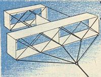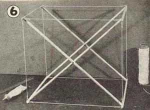 Cover the top, the bottom, and one end of each wing and each tail, and the portion of the stabilizer between the vertical struts, with paper or muslin. Cut the covering material ½" wider than the space it is to occupy. To cover the wings and tails, fold the edges of the covering material around the cords and secure them with glue; then glue the covers to the longerons. To cover the stabilizer, run lengths of reinforcing cord between the two tops and between the two bottoms of the vertical struts; then glue the cover to the cords and to the struts. If you use tissue paper, you can strengthen it now by applying a coat of linoleum lacquer to it. The kite should then look as shown in Fig. 7, and is ready for assembly.