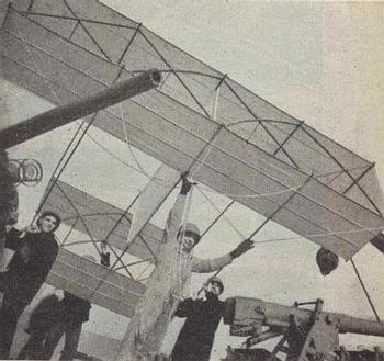 The kite is now ready to be flown. Wait for a fairly breezy day. Stay well away from woods or other obstacles that might cause gusty air currents. Let out about 50' of cord and have an assistant hold the kite at head level, pointing it upward at an angle of about 45 deg. Hold the line moderately taut. When the breeze is good, take a short run. The kite should rise immediately and continue to climb as you pay out line. If it rides on too even a keel, it may overrun you and go into a dive. To remedy this, add weight to the tail, an ounce at a time, in the form of lead sinkers or blocks of wood that are held in place by string. The kite illus- trated showed a pull estimated at 10 to 15 lb. during the test flight, which was made in a fairly stiff breeze.