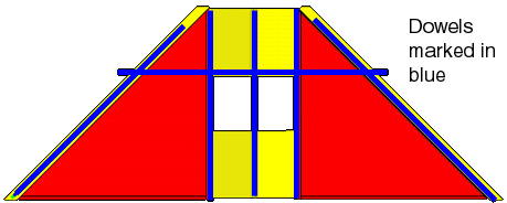 | Now what you need to do is get 4 three foot dowels for the uprights and cross member and two four foot dowels for the leading edge. After cutting them for a good fit, sew in the box and leading edge dowels by stitching the pocket openings at both ends. You can see that the leading edge dowels don't go to all the way to the top. The cross bar dowel should fit in snug in the pockets without bending. Well that is how I make the kite. |