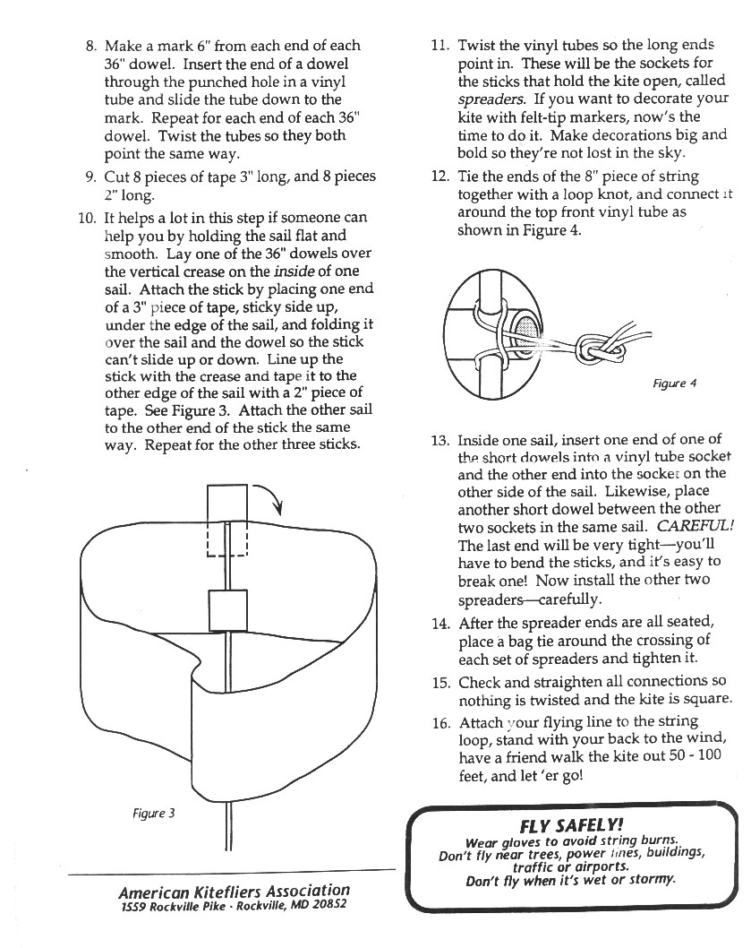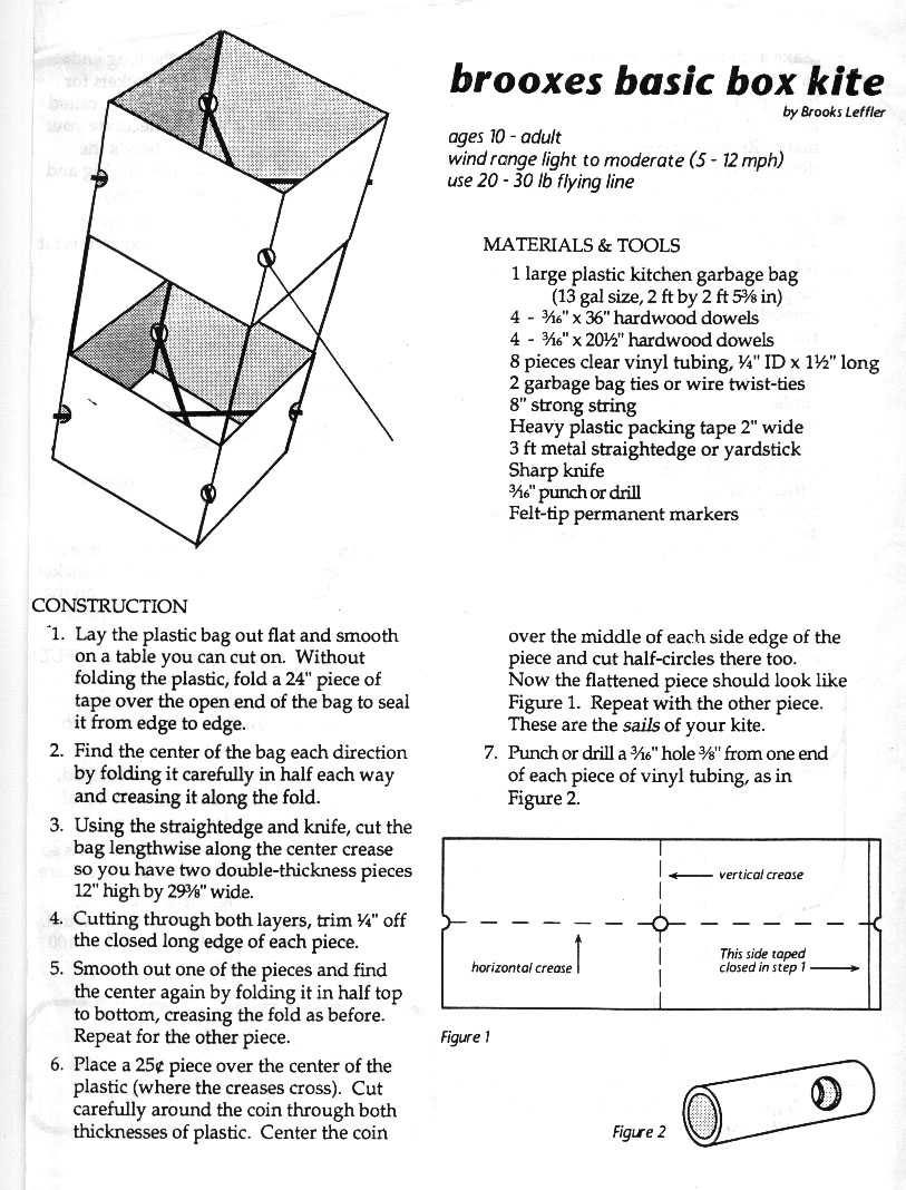So, you want to build a box kite but you have a limited budget. Here is the kite for you from the American Kitefliers Association. This one is designed to fly in light to moderate winds and is very forgiving. About the most expensive part of the kite is the quarter you use as a template to cut some holes in the covering. Well, that and a few wooden dowels. Part 1 shows a drawing of the kite and includes a materials & tools list. Part 2 continues with the instructions and includes a few common sense flying rules. The hand scanner I am forced to use did distort the page a tiny bit, but just consider it another challenge in building the kite. :-) If all else fails, notice the address at the bottom of the second page. You can contact American Kitefliers Association. This is where my original plan came from.
