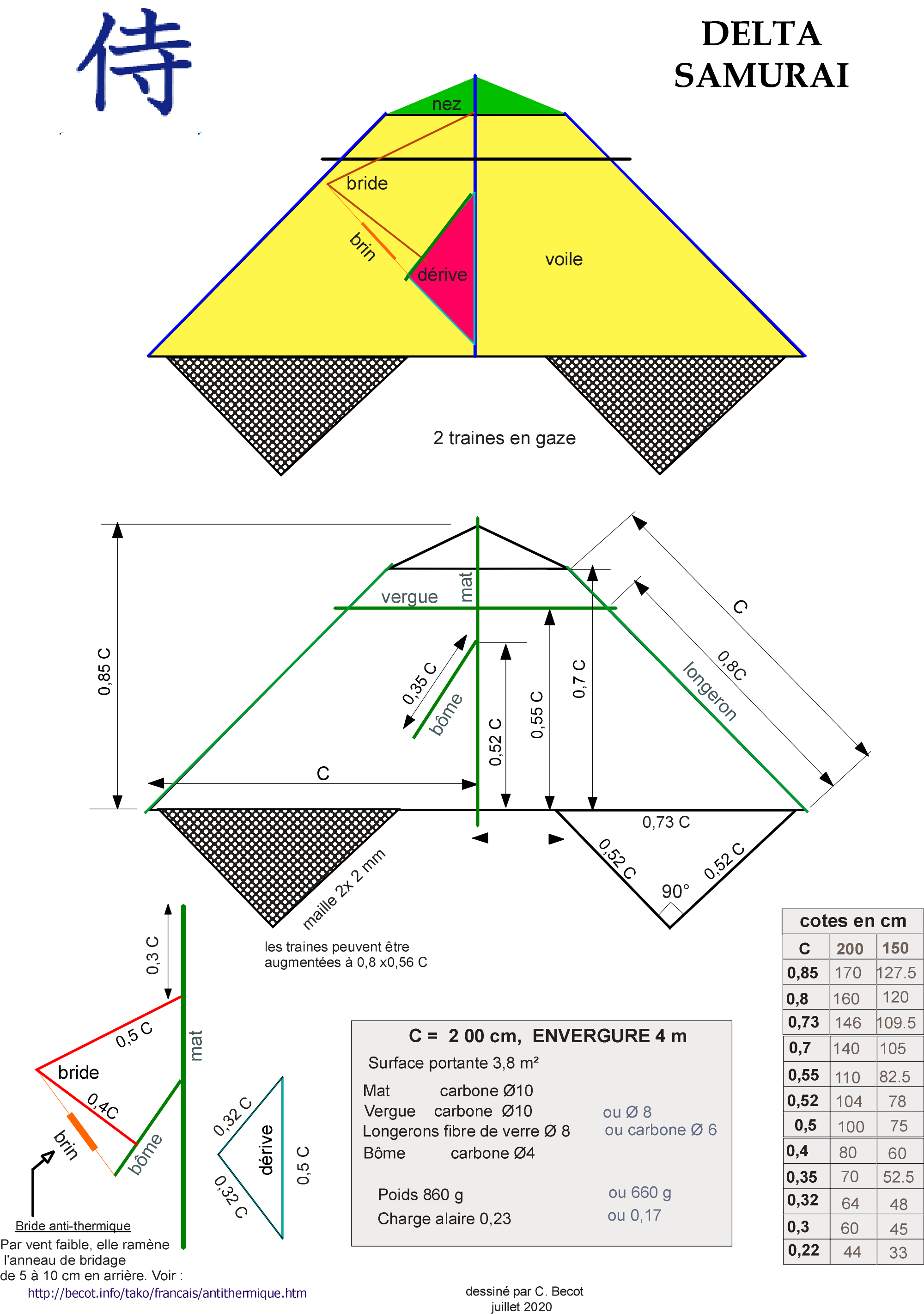 À l'usage cela s'est révélé insuffisant, alors j'ai recherché une traîne moins fastidieuse à fabriquer. Oubliant l'option d'un tissu ajouré avec des ronds découpés, la solution gaze a été testée en 2018 sur un petit delta et appliquée avec succès sur le Samurai en 2020.