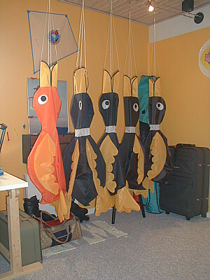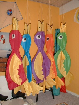 Die Näharbeiten beginnen zunächst mit Gedanken zur Farbwahl der Ente. Kens Ente flattert mittlerweile in allen möglichen Farbkombinationen am Drachenhimmel. Daneben fertigt Ken auch die sg. Duffy Duck an, eine Ente mit schwarzem Körper, weißen Halsband und gelbe Füße und Schnabel, die ganz besonders gut in der Luft aussieht.