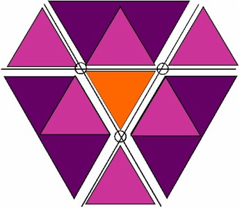 Grundplan. Die Kreise bezeichnen die Waagepunkte. Die Maße ergeben sich unkompliziert durch die gewählte Seitenlänge der Dreiecke.