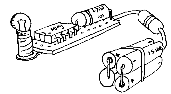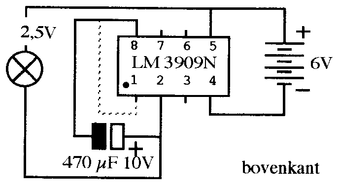 knipperen nogal laag. Op het schema zie je dat er slechts 3 componenten nodig zijn om het apparaatje te bouwen. Het lampje is van 2,5 Volt en die vind je in iedere zaklantaarn met 1 batterij (ze zijn ook in winkels te koop). Halogeen lampjes werken niet goed. De batterijen zijn 4 stuks van het type (mini-) penfight (AA). De stroom is uitermate laag, dus gebruik de kleinste batterijen die je maar kunt vinden, als je vlieger geen zware kan tillen. Soldeer de batterijen aan elkaar; stop ze niet in een houder want ze gedragen zich als bommen als ze naar beneden vallen. Zet ook het lampje vast in de fitting met een stukje plakband, zodat het hoog in de lucht niet lostrilt. Het geheel heel goed in je vlieger vastzetten. Op het schema is de LM3909 getekend vanaf de bovenkant gezien. Bij pen 1 bevindt zich een herkenningsstip op het huis. De elektrolytische condensator is tussen de 400 en 500 microfarad, 10 Volt. Let op de polariteit bij het monteren. Al met al kost een knipperlicht nog geen 10 gulden. Let er op, dat als je een lampje neemt voor een ander voltage, de schakeltijden enorm veranderen. Als het lichtje naar jouw idee te langzaam knippert, kun je door pen 1 met 8 te verbinden de knippersnelheid verdubbelen. Dit gaat uiteraard ten koste van de levensduur van het lampje. Dit simpele en goedkope apparaatje doet het minstens evengoed als de dure Xenon flitsers. Je kunt de lichtopbrengst nog verder vergroten door een reflector te nemen. Die ik gebruik heb ik gesloopt uit de zaklantaarn van mijn zoontje (die gebruikte die zaklantaarn toch niet meer omdat er geen lampje in zat). De reflector dient het licht uiteraard naar beneden te richten.