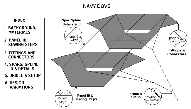 The proportions for the Navy Dove are from the 1997 the British book "Kites". This plan size is of the "Navy Dove - Small" shown in Gallery III. This scaled down size is easier to carry around and doesn't have the pull as the larger size. The size of the "Navy Dove - Large", also shown in Gallery III, is the size suggested in the book. Multiple all the plan dimensions shown for the panels here by a factor of 1.3x for the larger size. The original book plan called for "cusping" 1/2 inch in all the panels between splines. I did this on the larger version and did not "cusp" the smaller version. I didn't see any difference when flying.