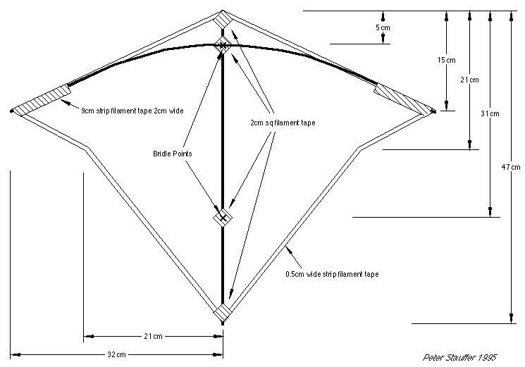1. Fold the sheet of Mylar in half with the side to be the front of the kite inwards. Plot out half the kite shape using the fold as the centerline. Mark the bridle points on the centerline with a line which will extend passed the width of the spine. Using a sharp knife and straight edge carefully cut around the outline through both pieces of Mylar. This will ensure both halves of the kite are perfectly symmetrical.