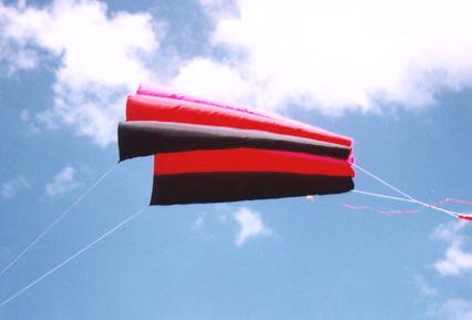 One final point:- when I scaled up this kite I found the kite tended to collapse as too much air was lost through the ends of the tubes. To stop this I sewed about 5cm up the middle of the end of each tube, dividing the end of the tube into two. This restricted the airflow exiting the tube, increasing the internal pressure and making the kite more ridged, and less prone to collapse. I also added some triangular side flaps, (see photo above) but this is strictly not required. and due to its large size, added a reinforcement line along the top (leading) edges of the `B' pieces, which connects to the bridle points in the corner. This plan was developed from the internet plan published by Buck Childers, at... This in turn was based on a short article in the Dutch magazine _De Zette Vieger_, Nbr.6 which references another kite newsletter by Piet van Stallduinen. A single page Postscript Version of this plan is also available, as it was originally published in a Local Club newsletter. | ||
