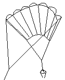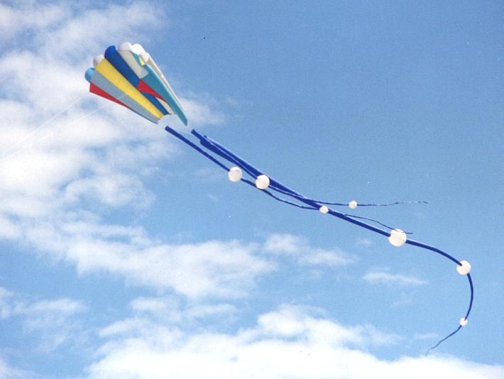 Start the process again but starting from the other end of the kite, with the opposite edge of the pieces. The last seam is the most difficult as you have to roll both groups of panels into the middle cell you are closing off. That is the whole kite is rolled up, inside the middle tube, which is then completed inside out. When the final seam has been sewn, pull the kite out of the middle tube to form its normal working shape. To the loops you sewed into the outermost seams of the kite tie a bridle line approximately 2 metres long. Then tie a loop in the middle of this line to attach the flying line. Repeat for the trailing tail lines which are shorter (about a metre). The plan calls for a drogue, to steady the kite. However a 5 metre ribbon tail will work just as well. almost anything will do as its job is only to remove some of the side-side `wobble', of the kite. Now go fly it :-) |