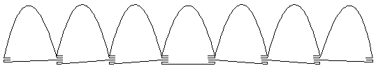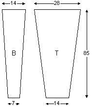 Panflute Kite (Revisited)The Pan Flute is a soft kite (no sticks) made of 7 connected windsock like tubes or cells. It has a good wind range and flies at an angle of 30-40 degrees. It flys with a side-to-side sway, or wobble, making this kite very pleasent to look at in the sky, particularly with a long ribbon tail, or other decoration. Start by making the two templates (or measure directly) to cut seven (7) of each type panel (`B' for the bottom, `T' for the top panel). For aesthetics try alternating contrasting colours for each cell or create a rainbow pattern. The kite is very forgiving, so while a hem allowance