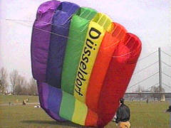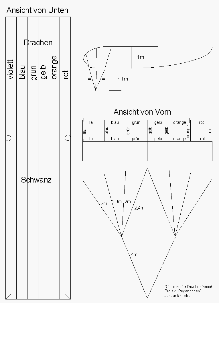 ![]() Die Vorgaben für das Projekt waren ganz einfach: Schön groß, nettes Design und einfach zu bauen. Stablos sollte es auch sein. Bauform und Größe sind auf optimale Stoffausnutzung ausgelegt. Da wir die 'regenbogenfarbige' Turbine schon seit einigen Jahren haben, wird mein dazu passender Designvorschlag nach überraschend kurzer Diskussion angenommen. Der Etat reicht für 3 der Drachen. Die technische Ausführung wurde von Peter Rieleit geplant, der im Umgang mit stablosen Drachen über reichlich Erfahrung verfügt. Das Profil ist ein selbststabilisierendes Profil mit gerader Oberseite, Der Flugwinkel stellt sich fast von selbst ein. |