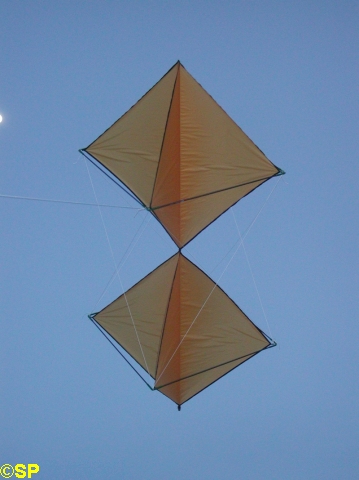Bisher sah ich den Bauplan zu diesem Drachen nur in einer alten Ausgabe der "Kitelines", einem Drachenbuch von Margreth Greger und auf diversen Seiten im Internet. Dieser Drachen ist relativ einfach und schnell zu bauen, da man "nur" 4 Quadrate versäumen und zusammennähen muss! Danach fehlen noch die Stäbe und die Spannschnüre. Durch diese verhindert man das Verdrehen der Zellen. Um den Drachen zu transportieren, nimmt man einfach die 8 Aussenstäbe heraus. Der Drachen benötigt natürlich etwas mehr Wind, jedoch durch seine Fläche und das Cfk-Gestänge dürfte er auch ein Drachen für das Binnenland sein!