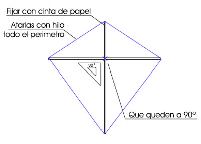 - Pegar las varillas a 90º entre sí, al papel o polietileno con cinta adhesiva, y luego colocar cinta uniendo las puntas de las varillas por encima del hilo, obteniendo un perímetro reforzado de cinta.