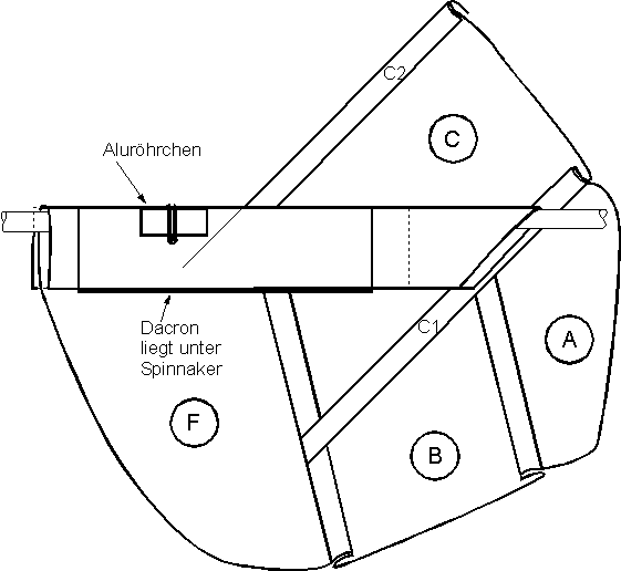 Breite gefaltete 65 cm lange Spinnakerstreifen wird das Segel bis in den Kniff