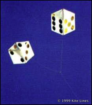 However, some years ago we published a photo from Gubbio, Italy (Winter, 1991-92) of a much larger cube kite decorated as a gambling die, being shown by Thorsten Schacht of Denmark (who is one-third of the team known as Dr. Hvirvelvind). And plans for a quite similar dice kite, about one meter square, appear in the 1995 book, Box Kites: Making and Flying, by Dr. Bill Cochrane. Finally, at the 1999 AKA Convention in Muncie, Indiana, we discovered our friend Barbara Hall flying two small dice kites branching from one line, which she had made in salute to the gambling mecca of Atlantic City, New Jersey, near her home.
