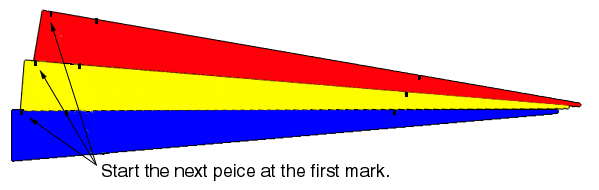 ![]() Lay out all the pieces in the order in which they will be sewn together and hem the long edges of each piece of the spinsock, making sure to leave marks visible to aid in the assembly process. It is important that you make sure that you fold over the hem in the same direction on all the pieces. This way all the cut edges will be on the inside of the spinsock. |