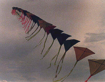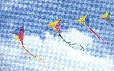 I would like to remind you that these designs are, by no means, the only ones you can make. Literally any kite design or shape of kite can be made to fly in a train of kites, that is, more than one kite on a single line. Experiment with any design that you think might make a good train of kites. When you begin to build and fly kite trains your imagination begins to function in multiples of one. There is no limit to your imagination, or to the type of kite or the number of kites in a kite train.