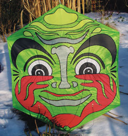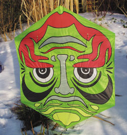 Wind. Ideales Drachenwetter! Der lachende Rokkaku wird in den Himmel